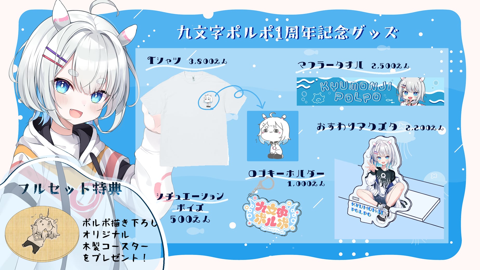 九文字ポルポ活動1周年記念グッズに含まれる、「Tシャツ」、「おすわりアクスタ」、「マフラータオル」、「ロゴキーホルダー」、「シチュエーションボイス」の5点全てが、1点ずつ付いてくるグッズセットとなります。